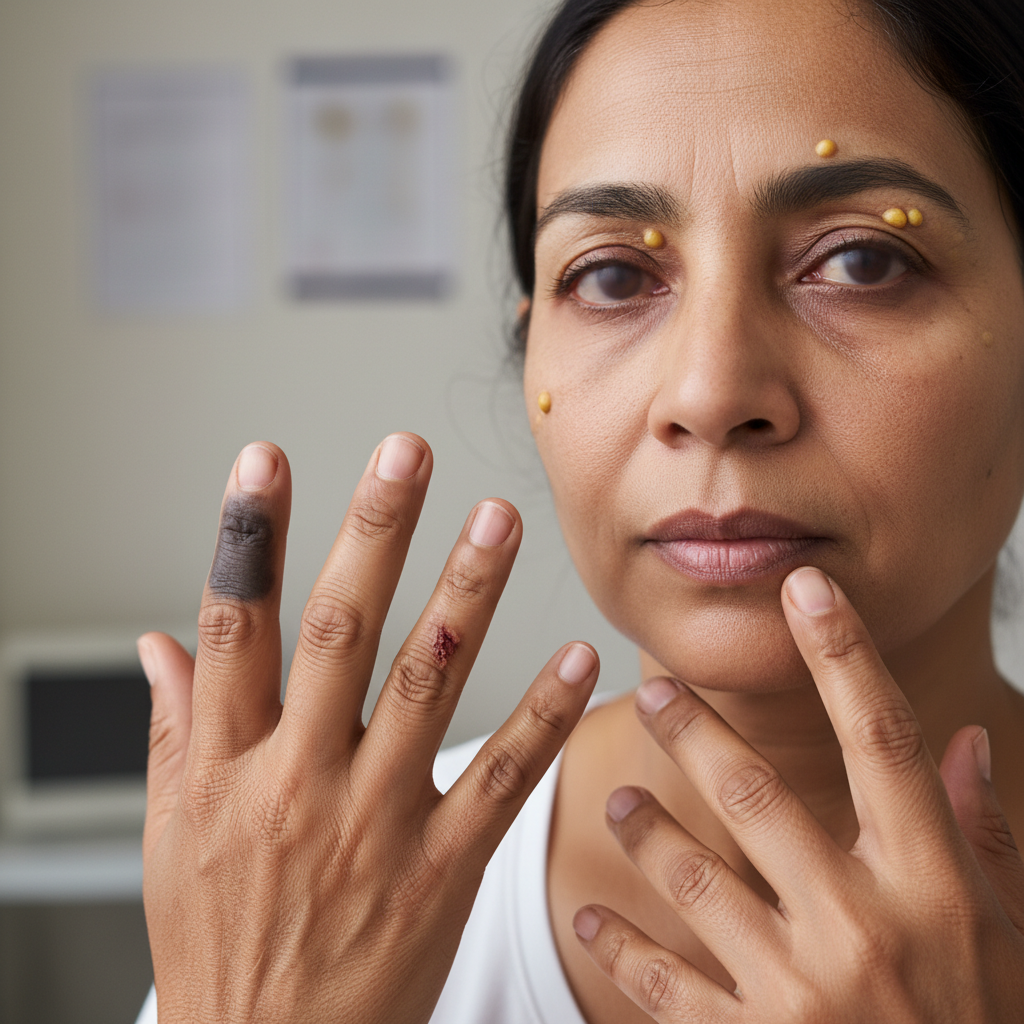 Diabetes mellitus, whether type 1 or type 2, produces numerous visible manifestations that reflect both acute hyperglycemic effects and long-term complications of chronic blood sugar elevation, creating a roadmap of metabolic dysfunction written across the human body. Acanthosis nigricans frequently appears as dark, velvety patches in skin folds, particularly around the neck, armpits, and groin, serving as a visible marker of insulin resistance that often precedes the development of type 2 diabetes by years. Diabetic dermopathy creates characteristic shin spots, appearing as small, round, reddish-brown patches on the lower legs that may be mistaken for age spots but actually represent areas of skin atrophy caused by diabetic microangiopathy. Necrobiosis lipoidica diabeticorum produces distinctive yellowish-red plaques with atrophic centers, typically on the shins, that can ulcerate and heal poorly due to compromised circulation. The eyes reveal diabetic retinopathy changes that, while requiring ophthalmoscopic examination to detect early stages, can progress to visible cataracts and even blindness in advanced cases. Foot complications become particularly visible, ranging from minor cuts that heal poorly to severe ulcerations, infections, and in extreme cases, gangrene requiring amputation. Skin infections, particularly fungal infections in warm, moist areas, become more frequent and visible due to elevated glucose levels that create favorable conditions for microbial growth. Slow wound healing becomes apparent as minor injuries persist for extended periods, while peripheral neuropathy may cause visible foot deformities and gait changes that reflect the progressive nerve damage associated with chronic hyperglycemia.