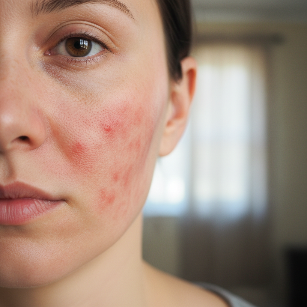 Measles, caused by the highly contagious measles virus, presents with one of the most recognizable rash patterns in infectious disease medicine. The characteristic eruption begins as small, red, flat spots that appear first behind the ears and along the hairline before spreading systematically across the face, neck, trunk, and extremities over a period of three to four days. This cephalocaudal progression is pathognomonic for measles and helps distinguish it from other viral exanthems. The individual lesions start as discrete macules but quickly become confluent, creating large areas of erythematous, slightly raised patches that give the skin a blotchy, mottled appearance. Prior to the rash's emergence, patients typically experience the prodromal phase characterized by the classic triad of cough, coryza, and conjunctivitis, along with high fever. Koplik spots, small white or blue-white spots surrounded by red halos on the buccal mucosa, appear one to two days before the skin rash and are virtually diagnostic of measles. The rash typically lasts five to six days before beginning to fade in the same order it appeared, often leaving behind temporary brown discoloration and fine desquamation. Despite widespread vaccination programs, measles outbreaks continue to occur in unvaccinated populations, making recognition of this distinctive rash pattern crucial for prompt isolation and public health response.
