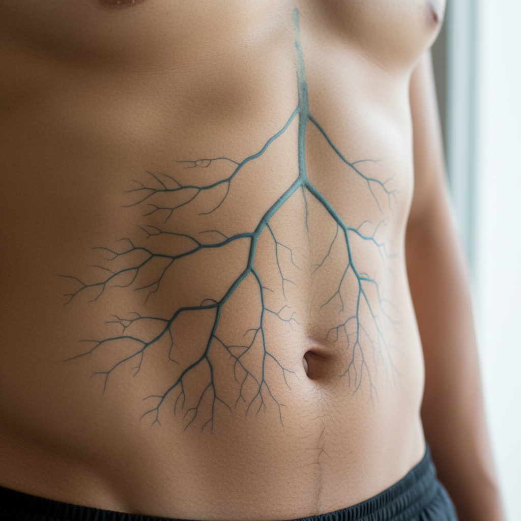 Visible veins across the abdomen can create various patterns that provide valuable insights into circulatory health and potential underlying medical conditions. Normal abdominal skin typically conceals the underlying venous network, making any prominent venous patterns potentially significant. The most concerning abdominal vein pattern is caput medusae, named after the mythological Medusa's snake-like hair, which appears as dilated veins radiating from the umbilicus (belly button). This pattern typically indicates portal hypertension, a serious condition where increased pressure in the portal vein system causes blood to seek alternative pathways back to the heart. Portal hypertension commonly results from liver cirrhosis, liver fibrosis, or other conditions that impair normal liver blood flow. The dilated umbilical and paraumbilical veins create the characteristic radiating pattern as they serve as collateral circulation routes. Other abdominal vein patterns may indicate inferior vena cava obstruction, where blockage of the large vein returning blood from the lower body causes superficial abdominal veins to dilate as alternative pathways. Pregnancy can cause increased visibility of abdominal veins due to increased blood volume, hormonal changes, and pressure from the growing uterus on major blood vessels. Weight loss may make previously hidden abdominal veins more apparent as subcutaneous fat decreases. Certain medications, particularly those affecting blood vessel dilation, can increase abdominal vein visibility. Athletic individuals with low body fat percentages may have more visible abdominal veins due to reduced subcutaneous tissue. However, any sudden appearance of prominent abdominal vein patterns, particularly when accompanied by abdominal pain, swelling, or other symptoms, should prompt immediate medical evaluation as they may indicate serious underlying conditions requiring urgent treatment.