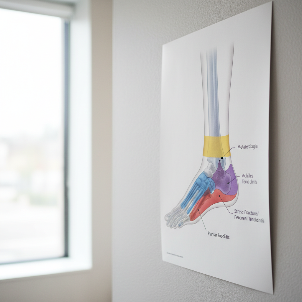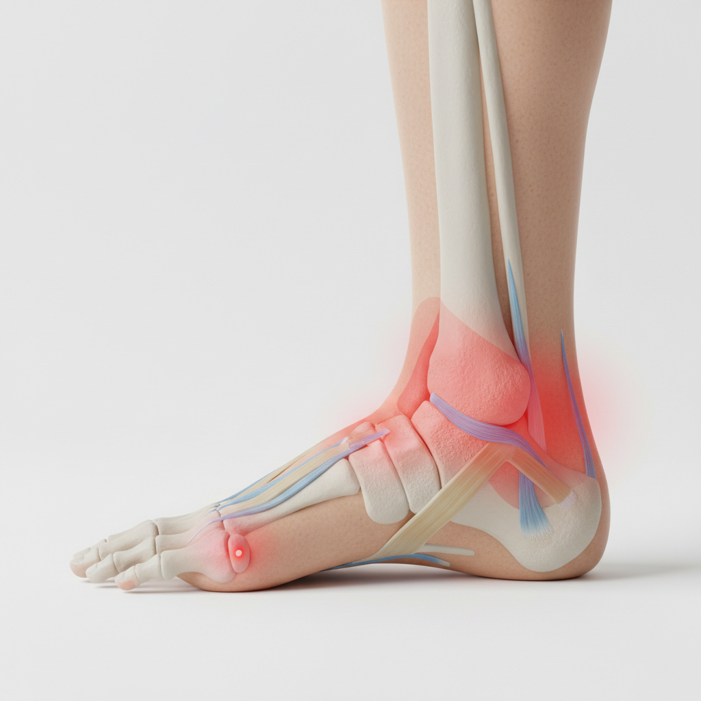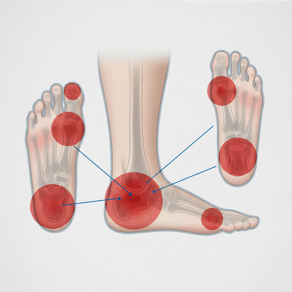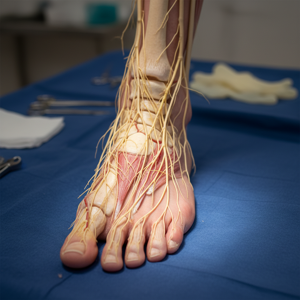 Nerve-related foot pain represents a complex category of conditions that can affect any area of the foot and often presents with characteristic symptoms such as burning, tingling, numbness, or electric shock-like sensations. Peripheral neuropathy, commonly associated with diabetes, can affect the entire foot and cause progressive sensory loss along with burning pain that may worsen at night. Tarsal tunnel syndrome, involving compression of the posterior tibial nerve as it passes through the tarsal tunnel behind the medial malleolus, can cause pain, numbness, and tingling that radiates into the